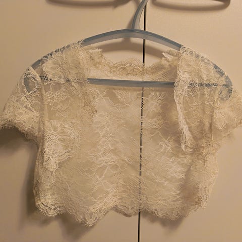Valkoinen hääpukuun sopiva bolero.Elastista pitsiä ja takaa 56, venyy 67 cm.One size.Nouto tai postitus.
