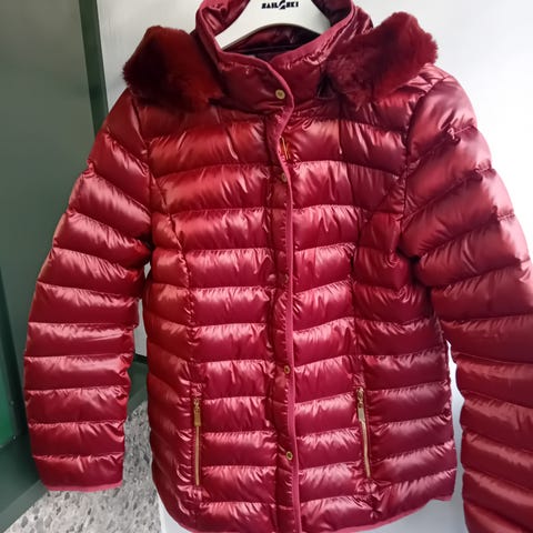 Kuvan mukainen tumman punainen kotimainen untuvatakki.