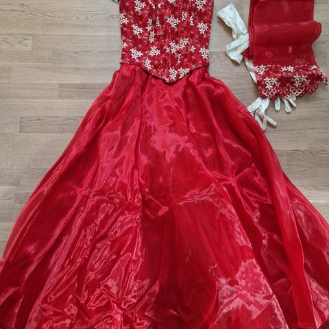 Mekko on käsintehty tanssiaismekko, jonka ikä on vähintään 50 vuotta. Hankittu vintage-liikkeestä.
