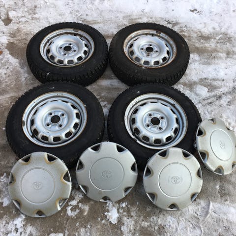 Mustat peltivanteet 4x100. Toyota Corolla Liftback -93 olleet. Päällä huonot Bridgestonet. Vanteet säilytetty kuivassa, siksi pölyä. Hinta netto.