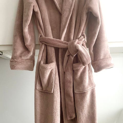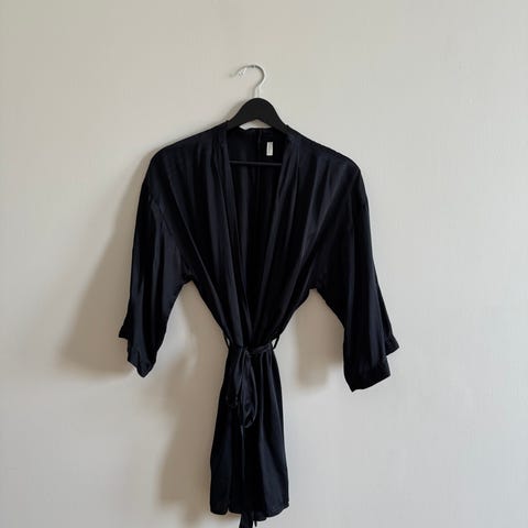 Tumman sininen lyhyt ja kevyt aamutakki. Pehmeää ja miellyttävän tuntuista kangasta. Ovh noin 120e. Hartioissa koristeena samettia. Suhkot lyhyt, nippanappa peittää takapuolen 170cm naisella. Koko on S mutta lyhykäisyyden takia suosittelen XS tai petite tytölle. 100% viskoosia.