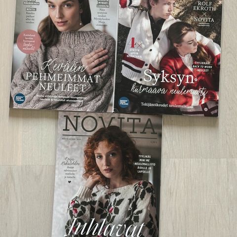 Myydään kolme Novitan lehteä. Kolme euroa kappale.