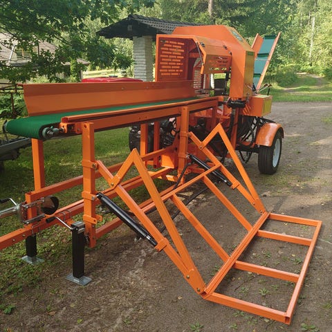 Tukkien katkaisusta huolehtii hydraulisesti toimiva ketjusaha. Pöllien mitta on helppo määrittää asettamalla stoppari oikeaan kohtaan. Halkaisusta huolehtii 20t puristava hydraulinen halkaisukone ja 4-osaan halkaiseva kirves. Kirves on säädettävissä helposti eri korkeuksille.