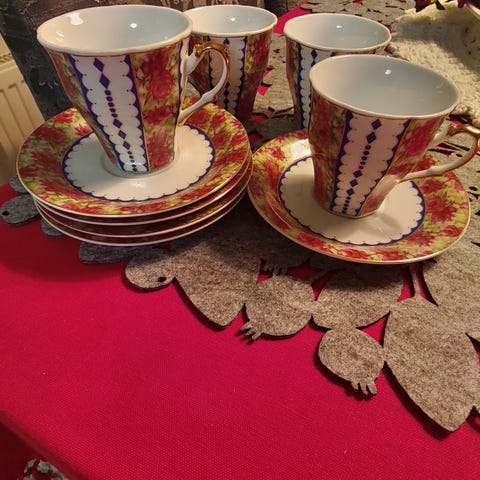 Miniatyyri kahvikalusto kahdelle tarjottimella. Posliinia. Hieman suurempi kuin nukkekodin kalusteet. Tarjottimen leveys 12,5 cm ja pituus 15cm. Kahvipannun korkeus 7 cm, kahvikupin korkeus 2 cm. Voin tuoda myös Helsinkiin