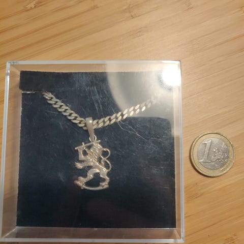 Lumoava Suomi Leijona -kaulakoru. Hopeaa, ketjun pituus noin 60cm. (Isompi versio)