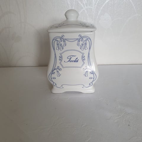 Musta/valkoinen posliinipurkki.Purkissa kierteellä suljettava kansi.Kork.18cm ja halk.12cm.Hinta:5e.
