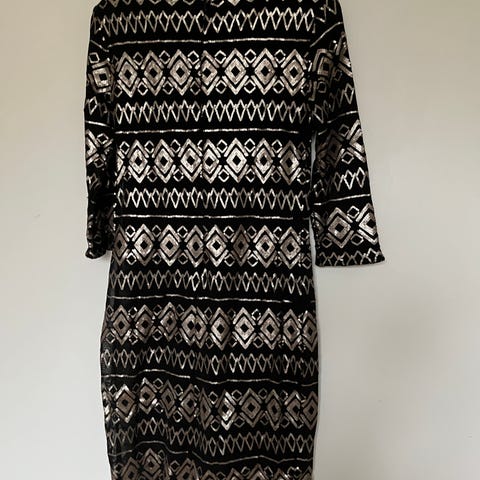 Upea paljettimekko, hihoissa ruusukkeet. Pituus 95cm. Käyttämätön. Lux Luna, Italia.