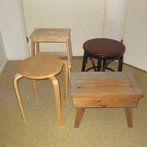 Neljä erilaista jakkaraa, IKEA Bekväm, saunajakkara ym. Pakettihintaan