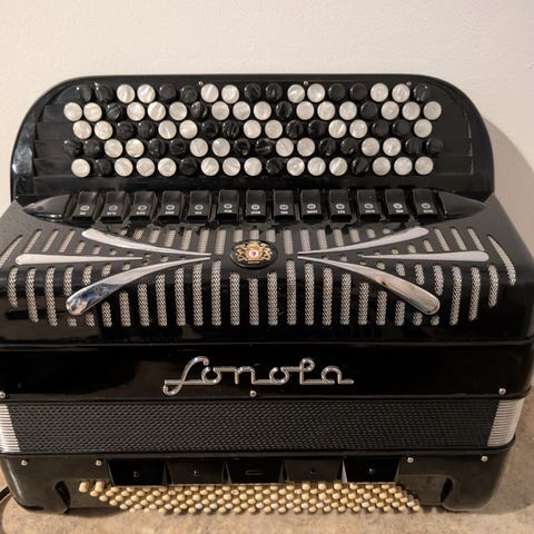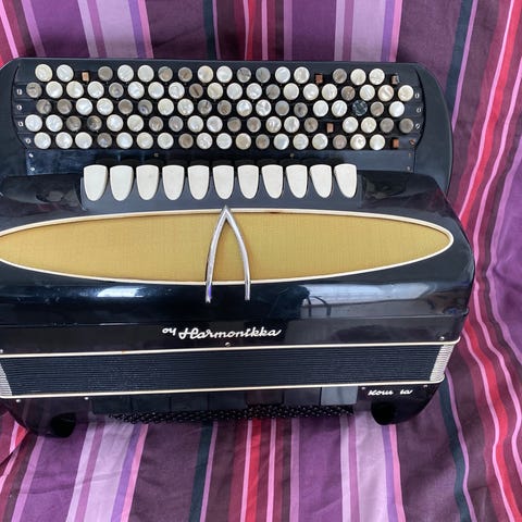 Hieno Kouvolan Maestro 5-rivinen harmonikka. Kova säilytyslaukku, täysin ehjä! Hyvä ääninen eikä palkeissa ole vuoroja.