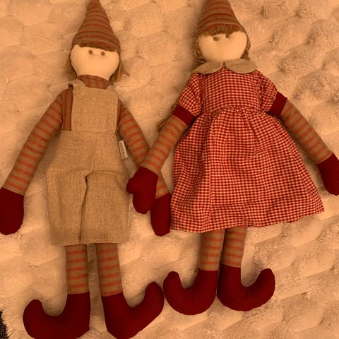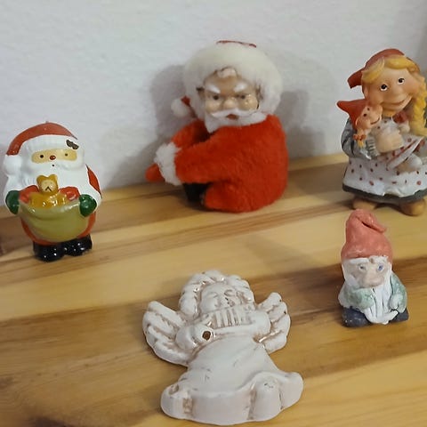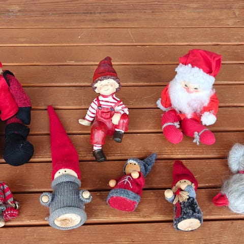 Myydään uudet metalliset tontut, metalliset kynttilänjalat, Pentikin iso pannulappu ja joulun punavihreät varvassukat.