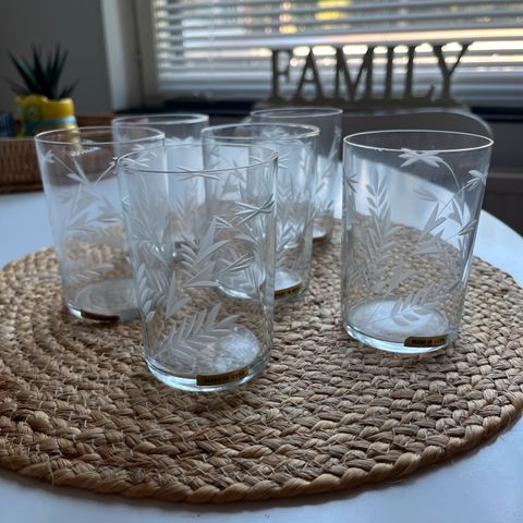 8 kpl retrotyylisiä juomalaseja, joissa lehtikuvio. Kunto kohtalainen, laseissa sameutta (ks. kuvat). Neman Glassworks merkkisiä. Korkeus noin 12,5 cm.