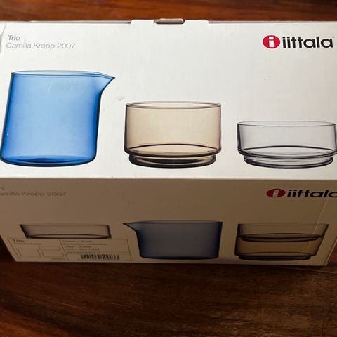 Priimakuntoinen, alkuperäinen pakkaus vuodelta 2007. Ultramariininsininen kannu 45 cl ja 2 kulhoa: väritön kulho 20 cl ja hiekka (väri) kulho 30 cl. Pinoa missä järjestyksessä haluat. Design Camilla Kropp. Nouto Hki tai postitus (+pm).