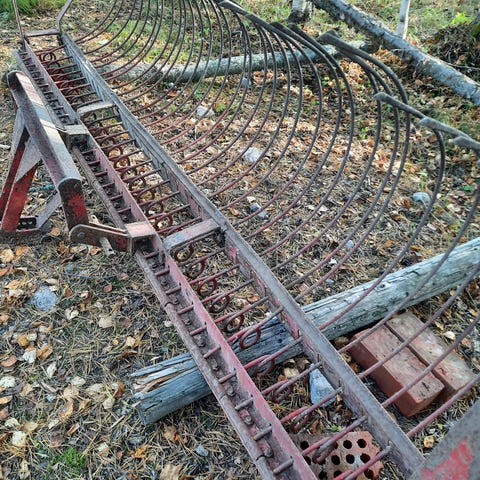Vanha traktorikäyttöinen pyöröharavakone.