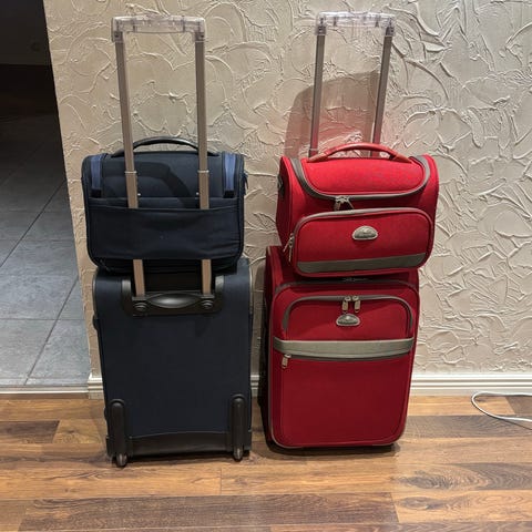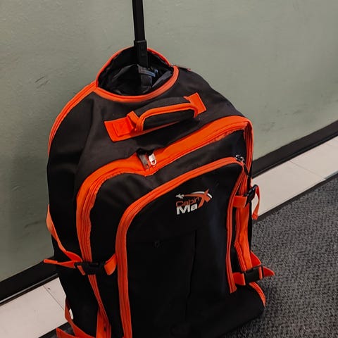 Vetoketju päällä. Takana tarrakiinnityksellä saa laukun kiinni matkalaukkuun