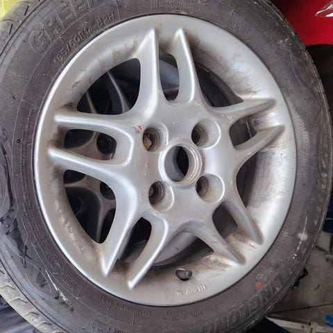 Myynnissä hyväkuntoiset mopoauton vanteet ja renkaat.