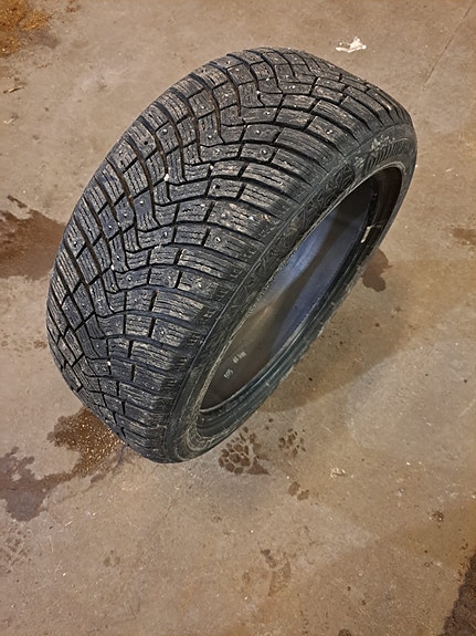 Erä siirtoajettuja renkaita talvipinnalla vanteineen