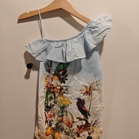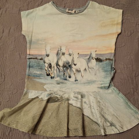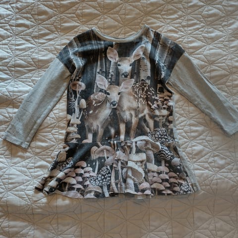 Hyväkuntoinen tyttöjen mekko/tunika. Koko on 98/104, mutta meillä käytettiin vielä 110/116 koossakin. Pehmeää materiaalia viskoosi 95%/elastaani 5%.