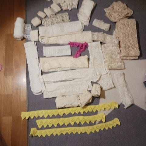 5 x 40 cm (x2). Valkoista käsinvirkattu pitsiä .Vanhasta tyynyliinasta leikattu.