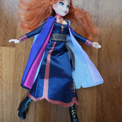 Disney Frozen Anna nukke sinisellä mekolla. Nukke esittää Anna-hahmoa suositusta Frozen-elokuvasta. Sopii leikkeihin ja keräilyyn. Korkeus noin 40 cm. Materiaali muovia ja kangasta.