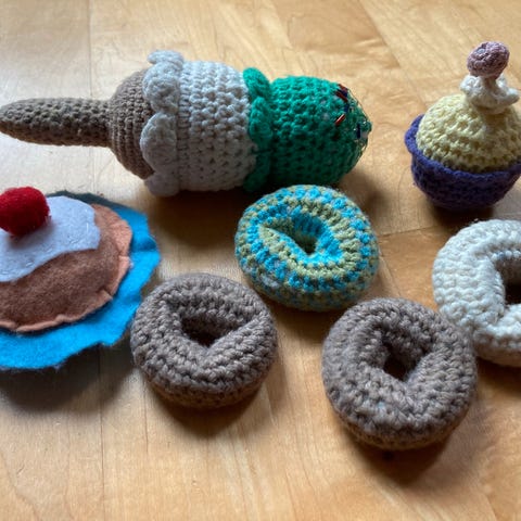 Myydään Thorbjorn Frosty desserts leikkijälkiruokapaketti. Siististi leikitty. Yhdessä tarjoilualustassa kaksi hattivattitarraa, näistä kuva.