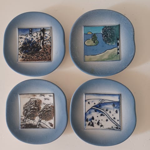 Myydään Arabian Heljä Liukko-Sundströmin suunnittelemat vuodenaika taulut, koko 11,5 x 11 cm.