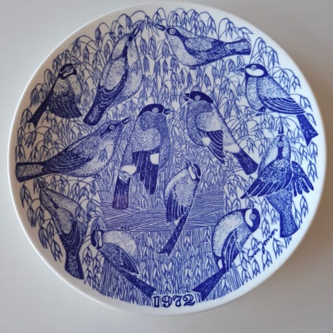 Todella kaunis ruotsalainen joululautanen Gustavsbergin tehtaalta. Suunnittelija Paul Hoff. Rajoitettu painos. Paul Hoffin ”Uhanalaiset eläinlajit” (Arter i fara) -sarja sisältää joitain hänen tunnetuimmista keräilijälautasistaan. Ne on valmistettu luuposliinista, ja niissä on aiheita pohjoismaisesta eläimistöstä. Kuva painettu aidolla kullalla. Halkaisija 25cm.