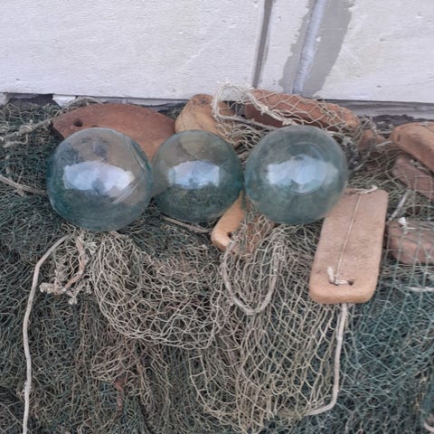 Vanha verkon merkki lasipallo josta tehty valaisin. Lasipallon ympärillä punottu naru. Mukaan myös käsin taottu metalli kannake. Sekä pari palaa korkki kelluketta. Kaunis ja erikoinen valaisin.