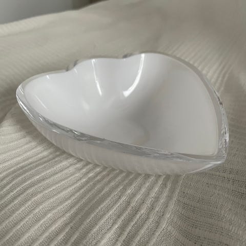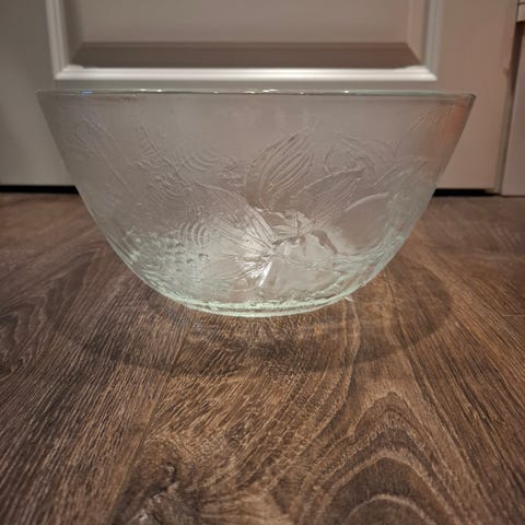 Iso muotoiltu lasikulho,painava. Ei kovin korkea,mutta leveä. Pysyy hyvin paikallaan. Pyöreä kierteiset kuviot. Vähän mustaa värityksessä.