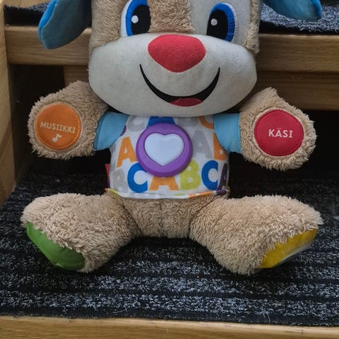 Myydään Fisher-Pricen lelukoira, käytön jälkiä on -mm nenästä väriä lähtenyt. Vingahtaa satunnaisesti vetäessä. Postitus onnistuu.