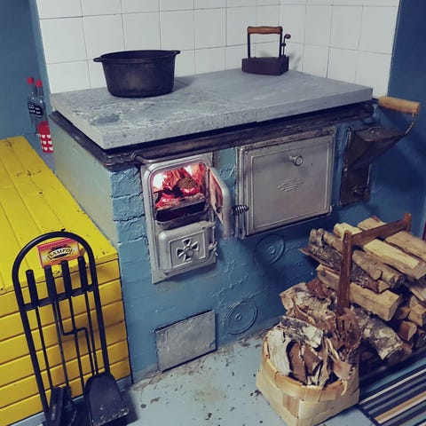puuhellojen/liesin päällä lämmönvaraajakiviä suomalaisesta vuolulivestä; Kivitehtaalla Hyvinkäällä,