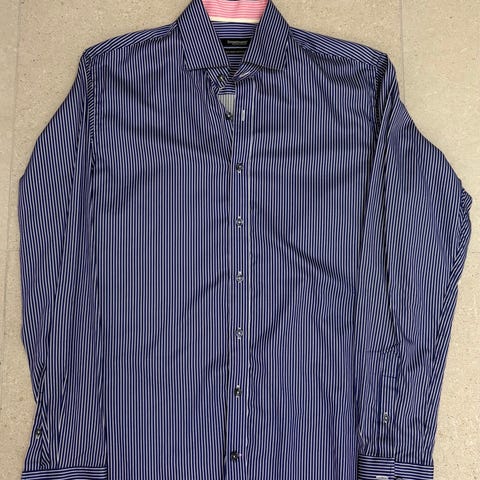 Tummansininen kauluspaita, jossa pieniä valkoisia pilkkuja. Hyvässä kunnossa