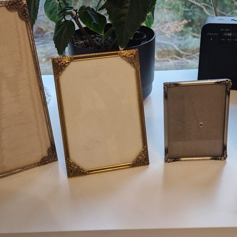 Setti kehyksiä, pari irtonaista ja loput kiinni toisissaan. Materiaali muovia ja puuta. Nouto.