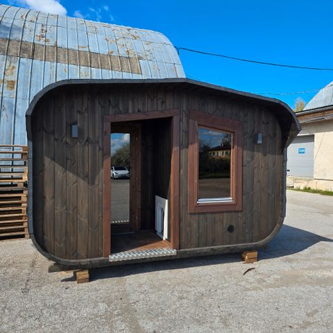 Lattia valmistettu veden kestävästä vaneerista sisältäen saunavesien poiston,lattiaritilät.Katto eristetty finnfoam 30mm.Musta rullahuopa.Lukittava ovi karkaistulla 2 kertaisella pronssilasilla 700x1900.Saunan lasi 1825x2030 karkaistu 2 kertainen pronssilasi.Takaseinän ikkuna 1320x340 +180 eur.Sauna käsitelty sisältä saunasuojalla.Ulkopuoli käsitelty puuöljyllä sävyn saa itse valita.
