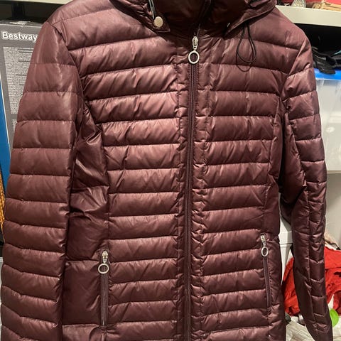 Ihana ja lämmin Indiskan murrettu oranssi untuvatakki. Ollut pari vuotta käytössä muiden takkien ohessa ja muuten siisti ja hyväkuntoinen, mutta huppuun osunut silitysrauta ja se korjattu laadukkaalla vaatelaastarilla, joka kestää hyvin pesuakin. Tämä hinnassa huomioitu. Viime kauden jälkeen ohjeen mukaan pesty ja siitä johtuen saumoista puskenutta untuvaa vielä siellä täällä. Silti edelleen muhkea. Koko XS mutta Indiskan tapaan erittäin reilu. Itse olen M/38 kokoa, 172cm pitkä ja on sopiva. Niska-helma 105cm, kainalo-kainalo 55cm, kainalo-hihansuu 49cm.