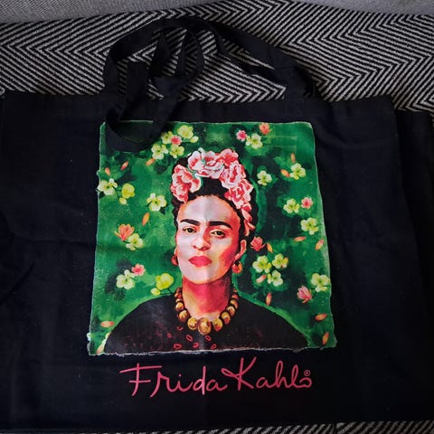 Kangaskassi: Toisella puolella printtiteksti Woman, toisella puolella Frida Kahlo-merkki. Sulku nepparilla, sisällä vetoketjutasku.