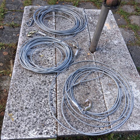 Käyttämättöntä pyykkinaruksi tarkoitettua vaijeria. Käy toki moneen muuhunkin rakenteluun. Kelassa on vaijeria 90 metriä ja se painaa noin 8 kg.