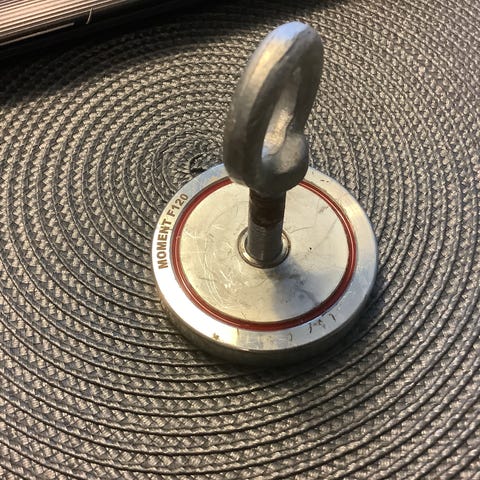 Voimakas neodyymimagneetti. Rakenne A3 teräs ja 304 RST. Koukulla ja 10m vaijerilla. Magneetin koko 90x68mm.