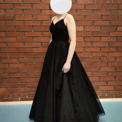 Ihana musta vanhojentanssimekko/juhlamekko edessä hopeanvärisiä koristeita. Olkaimet ommeltu jälkikäteen. Kerran tanssittu mekolla.