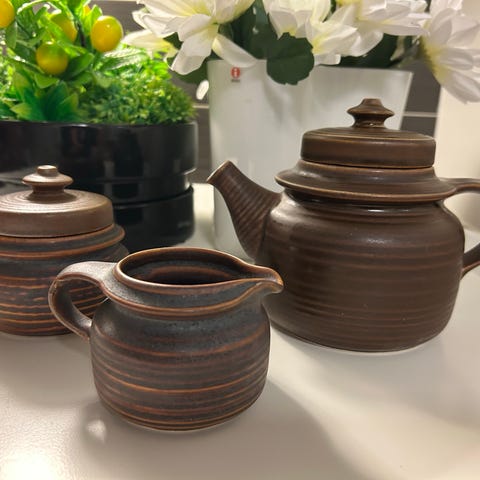Kuvassa yksi tuopeista on sävyltään harmaampi ja pinnoite ”karheampi”, mutta se tuoppi on myyty. Näitten tuoppien lasitteet yleisestikin eroavat toisistaan eri vuosien malleissa. Erilaisia värilasitteita kokeiltiin ja kehitettiin Arabian omassa laboratoriossa. Muissa viidessä jäljellä olevissa lasite on samanlainen.