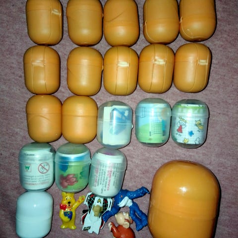 Mm. Kindermunista saatua pikkusälää esim. joulukalenteriin. Erilaisia figuureja, stressileluja, hyrriä, sormuksia, pari autoa ym. Yritin mahdollisimman paljon koota kuviin, mutta osa jäi irrallisiksi. Kaikille ei siis välttämättä löydy paria tai ole kaikkia osia tallessa.