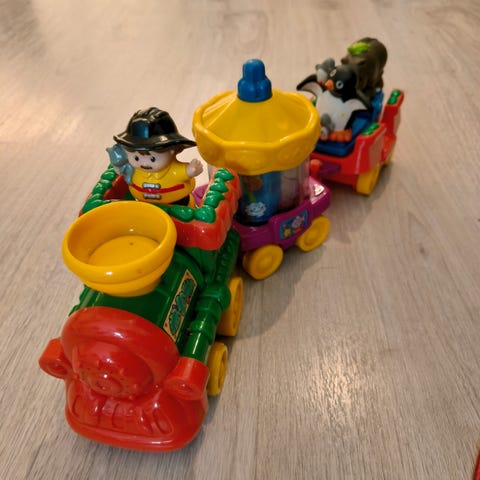 Palikkajuna, ukko ja kuutio. Juho Jussila oy. Enemmän käytetty, edelleen käyttökuntoinen. Kuutiosta en mene takuuseen, oliko alkuperäinen vai menikö muitten kuutioitten kanssa sekaisin.