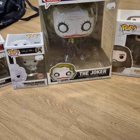 Myydään Suicide Squad-joulusukka 50cm glitterikoristeella, Funkopop jouluJokeri ja jouluHarley sekä Bruce-hyeena.