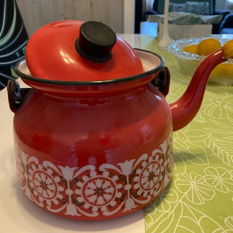 Raija Uosikkisen Finelille suunnittelema Punahilkka- emalikahvipannu. Pannut olivat tuotannossa v. 1962-68. Tilavuus on n. 1 litra. Pannu ei ole täysin virheetön, mutta siisti kuitenkin, kts. kuvat.