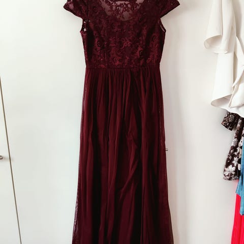 Pitkä mekko juhlallisen tilaisuuteen. Nilkka pituus. Gaalaan sopiva. Naru olkaimet. Hiukan venyy sivulle. On valuva ja ei tarvitse silitystä. Ruusuke irroitettava. Toimitus toridiilillä