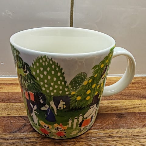 Myynnissä kuvan tuotannosta poistunut Arabian muumimuki Muumilaakso. Tätä muumimukia on yleensä tarjolla verkkokaupassamme tarrallisena ja/tai tarrattomana. HUOM! Kaikki tuotteet myydään verkkokauppamme kautta. Katso tuotteen hinta verkkokaupasta, linkki tämän ilmoituksen alaosassa. Tämän ilmoituksen tuotekuvat ovat kuvaamiamme esimerkkikuvia. Myynnissä olevan muumimukin tuotekuvat löydät verkkokauppamme tuotekuvauksesta.