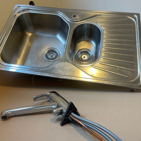 mitat 91x51,5. Ison altaan syvyys n.14cm ja pienennän n.7cm. Pinnassa vähän valkoista maalia (näkyy kuvassa) Mukaan tulee kuvassa näkyvä Oraksen hana, astianpesukone liitännällä. Allas ollut pitkään varastossa, joten hanan kunnosta ei täyttävarmuuttaa, ainakin tiivisteet on syytä vaihtaa.