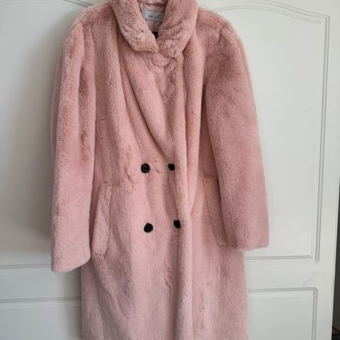 Vaalea teko turkis. Nepparikiinnitys. Nepparin kohdassa turkis tullu napin alta pois, mutta kiinnittyy kyllä vasta kappaleeseen takin sulkemiseksi