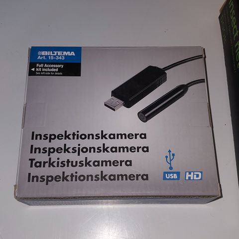 Endoskooppikamera ladattavalla akulla ja lisäosilla.