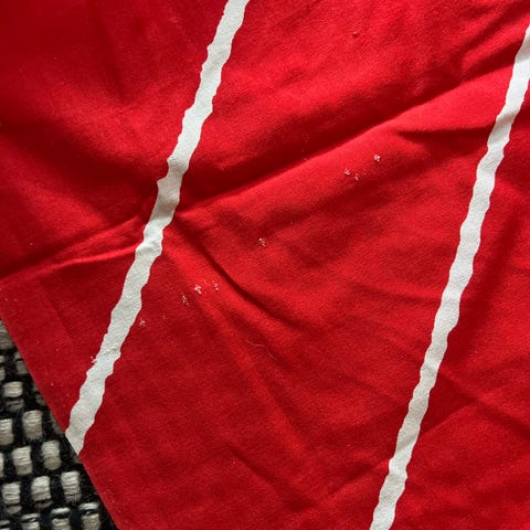 Hieno 60-70-luvun verho. Aavistuksen päivettynyt mutta silti värit loistavat hienosti. Korkeus 140cm ja leveys 128cm