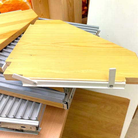 Lakattuja Lundia hyllytasoja valkoisella ja ruskealla päätyraudalla.